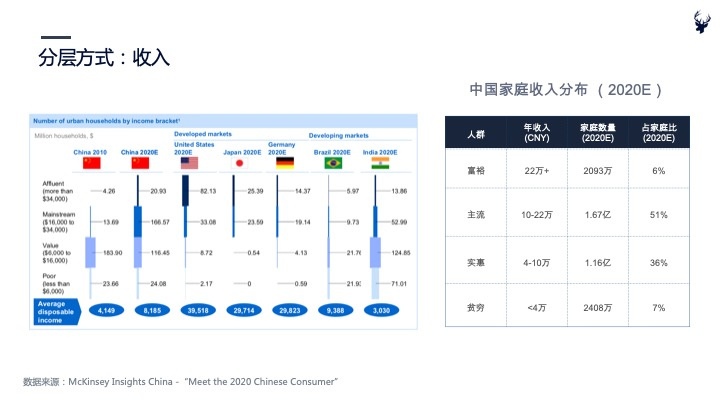 麦肯锡把各个国家的收入分成四个bucket:富裕、主流、实惠、贫穷,并进行了跨国的比较。他们还预测了中国2020年人群收入分布,在右边我换算成了人民币。麦肯锡预计,2020年收入超过22万的富裕家庭会有2000万个,占总家庭数的6%。这十年变化最大的人群是收入10-22万的主流人群,这部分人群翻了十倍不止,预计2020年占总家庭数的51%。