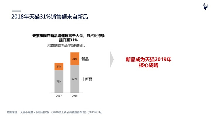2018年,新品占天猫营业额的31%,而且这部分营业额的增速是大盘的两倍。因此,2019年,新品成为了天猫的核心战略。