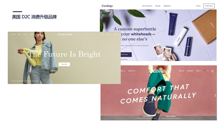 这是美国VC-backed的一些消费公司,卖衣服的Everlane、卖鞋的Allbirds、卖治疗痘痘的护肤品的Curology 。你看这三个牌子,他们的官网风格是不是特别像?我觉得他们基础人群画像上差别不会太大,都是给美国8000万的中产提供更好看、更年轻、更有性价比的选择。但这样的品牌,进入中国市场,就要面对一个取舍的问题。