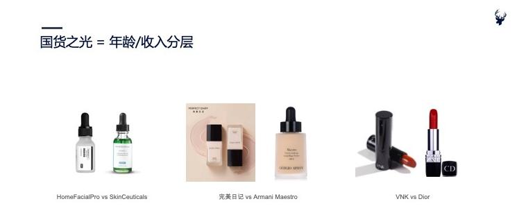我选了这几个国货之光品牌的爆款,给大家做一个价格比较。HomeFacialPro天猫卖的最好的产品,是这款月销5万的去痘印原液,专柜价229,它benchmark 的产品,是欧莱雅旗下的修丽可的精华,天猫售价是595,三倍的价格差。完美日记就更便宜了。在坐的姑娘们用什么粉底,我大概也能猜到。欧美系Armani 大师,日系用CPB,土豪用La Prairie,没有1000也要800,La Prairie 快2000一瓶。完美日记家卖的最好粉底液呢?天猫价129,月销20万瓶,现在还在半价折扣。口红也是,一支Dior、香奈儿、YSL 要3-400。VNK 天猫卖65,现在搞活动买二赠一。