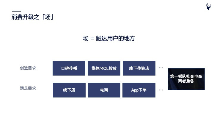 场是什么?场就是触达用户的地方。场分两种。一种是创造需求的品牌营销,包括口碑传播、媒体和KOL 投放,线下体验店等等。这是为了创造需求、种草的场,为了在未来某一刻进行转化。第二种是满足需求、拔草的场。被种草后,你会去哪里购买?你会选择线下店,或者电商搜索、还是去App 下单。