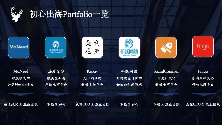 最后,我们梳理一下今年初心的布局:我们投了印度领先的持牌Fintech平台MoNeed,是一家强本地化加混血团队。海捷紫华目前是欧美全品类的严选电商平台,这个团队是年轻+有初心的沙里淘金型创业者。Kepay是尼日利亚目前最大的移动支付平台,属于成熟CEO加上混血团队。千跃网络是面向欧美日韩的女性向休闲游戏平台,属于年轻有初心的沙里淘金型创业者。SocialCommer是印度社交化移动电商平台,属于年轻加上有混血团队且有印度当地的合伙人。Fingo是东南亚社交化移动电商平台,属于成熟CEO加混血团队。成熟CEO,混血团队以及年轻增量的团队是我们目前布局的6家公司能够总结的共性。