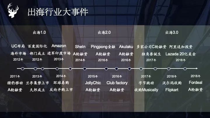 沿时间轴来看,2011年猎豹移动A轮融资,工具出海最典型的互联网公司;2012年UC开始布局海外市场,同年百度国际化成立,2012年基本上是工具进入新兴市场的元年。2013年兰亭集势上市,这是中国出海的第一家成功的上市公司,以PC端为主,虽然市值不高,但也是行业圈非常重要的一个节点,前段时间兰亭被并购的消息,也引得一阵唏嘘。同年久邦成立,也是工具出海领域一家非常大的公司。然后2013年亚马逊进军印度市场,这点是电商巨头公司在新兴市场的第一个重要布局,刚才提到,美国公司其实非常不情愿做本地化,但是即使像亚马逊这样高冷的公司,他仍然在印度市场建立了自己的office,而他在其他的地方,不管是中东、拉美,包括欧洲都是一个产品打全球,而唯独在印度建立了当地团队,而且这件事远在2013年。2014年环球易购反向并购上市,这家公司也是目前A股市场上唯一一家跨境电商公司,当时也是通过反向并购一个不太顺利的方式登陆了A股市场,最高市值接近300亿元。以上是我们视角下的出海1.0,以工具出海为主,配合几家先驱的典型公司上市。