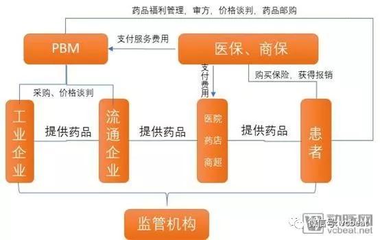 在付款人(医保、商保)到药店之间还有一个角色——PBM即药品福利管理,其职能是处理审核患者处方,并将药品需求对接给零售药店(有时候它也自己邮寄配送)。