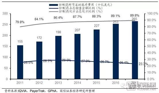 2011-2017年美国仿制药处方量与销售额的占比情况