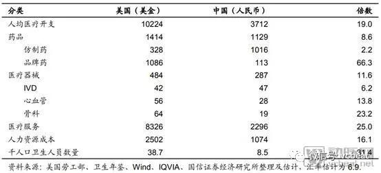 美国人均医疗开支达到中国的19倍。但是仿制药仅为2.2倍。同时服务的金额(除去医疗器械和药品,包括保险等各类依附于服务的类别)达到了25倍。
