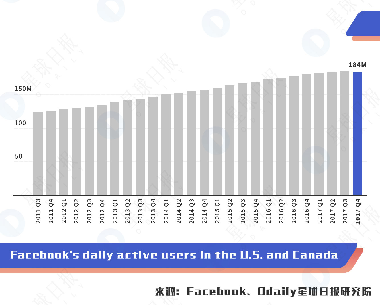 实际上,在 2017 年底,Facebook 的日活跃用户已经开始下降,尤其是 Facebook 的主要市场美国和加拿大: