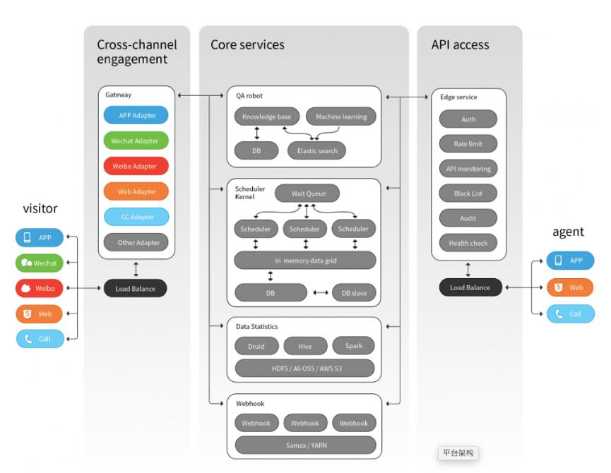 以下是去中心化即时通讯网络 TOP Network 和移动即时通讯云计算 PaaS 环信的系统架构图对比: