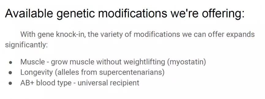 Bryan 的理想就是实现这一切。他在一份商业计划书中明确表示,要让父母们能生出转基因婴儿,他们“无需锻炼就能长肌肉”、拥有“超级人瑞”(年龄超过 110 岁)基因、或是“AB+血型的万能受血者”。
