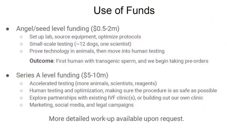 在 Bryan 的商业计划书中,他表示并不会像此前中国科学家贺建奎那样,在卵子受精时才将基因编辑蛋白分子注入,而是采取一种更为极端且令人不安的方式:对男性志愿者的睾丸实施相关基因治疗,让携带已经强化过的 DNA 的精子直接让女性受孕!Bryan 认为,仅需要 200 万美元就可以快速从动物试验转为人体试验。“资金使用成果:首个转基因精子人类,我们已经开始接受订单”,计划书中如此写道。