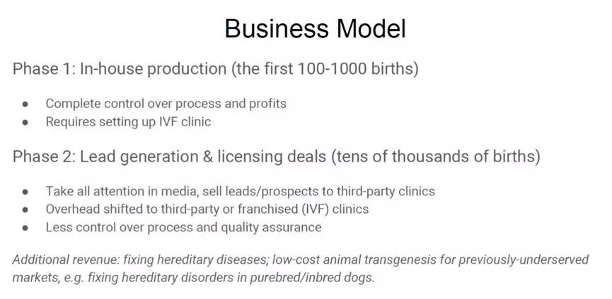就在几周前,《麻省理工科技评论》收到某“关切人士”发来的 Bryan 公司的融资商业计划书,里面就描述了公司将如何通过每年制造成百上千个基因编辑婴儿,从而实现数十亿美元年收入的“宏伟蓝图”。