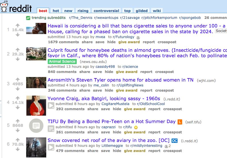 Reddit首页截图,可见其技术、娱乐、社会新闻等内容丰富且用户活跃