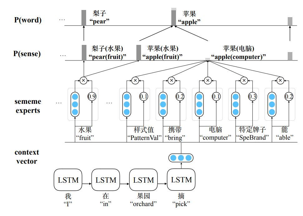 如上所示为结合 HowNet 义原知识的语言模型架构,在给定循环神经网络的上下文向量后,模型会预测每个义原将在下个词中出现的概率,并借助上下文向量和义原信息进而预测词义(sense)的概率和词(word)的概率。