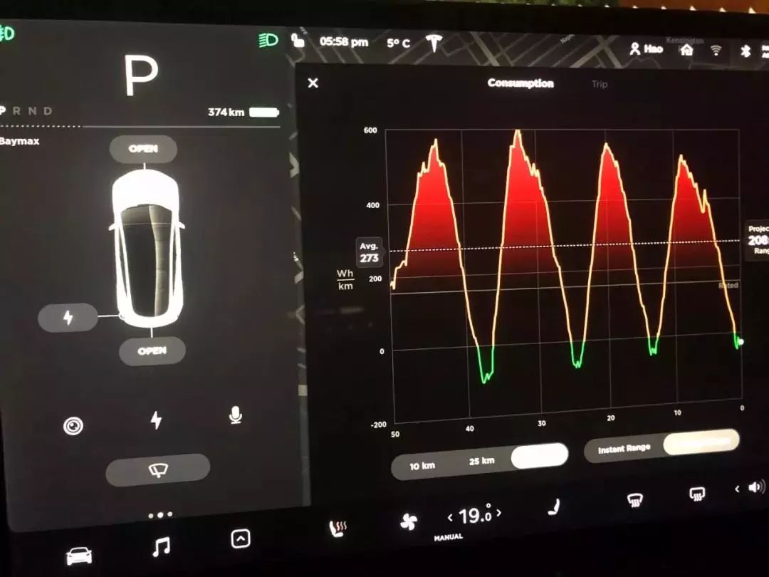 在山路上,这个数据就说不准了。我日常上学在一座山上。每日规律地上山费电下山充电,把大白的能耗跑成了三角函数图像。日常只跑 6 公里上学加 6 公里下学。车还没热身进入最佳能耗,就到学校了。所以我跑出了惊人的 273 Wh/km……按这个计算,我的车续航只有 274 km……