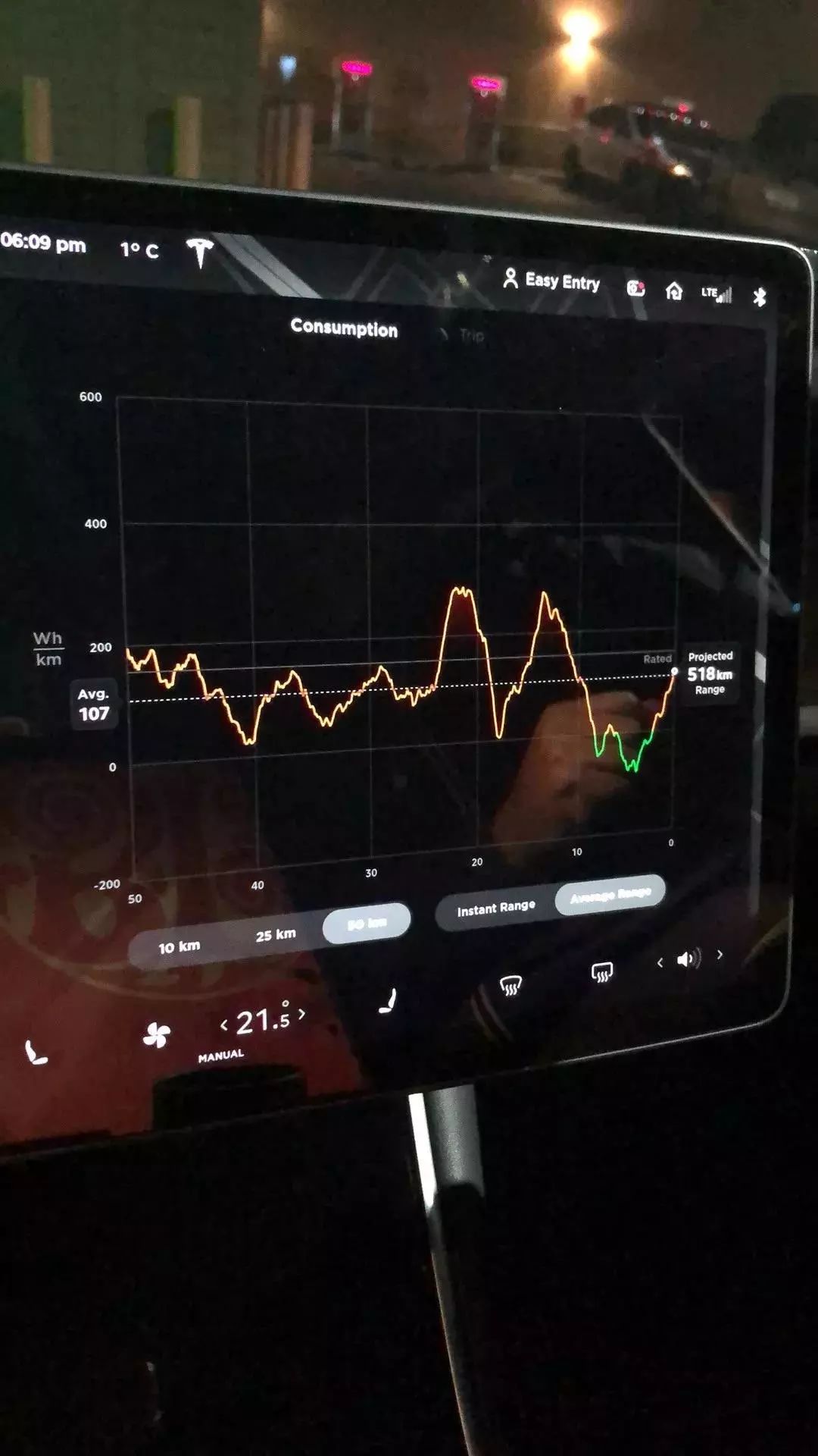 能耗问题,上山时能耗明显要多不少,加上温度寒冷,到达平均 300 Wh/km。下山时,能耗因为出现回收,大概平均稳定在了 110 Wh/km。整体下来大概在 200 Wh/km。根据特斯拉电池在 75 kWh 计算,续航在这次旅程中大概在 375 km 左右。温度 1 度,并且有山路折损。总体还是表示满意的。