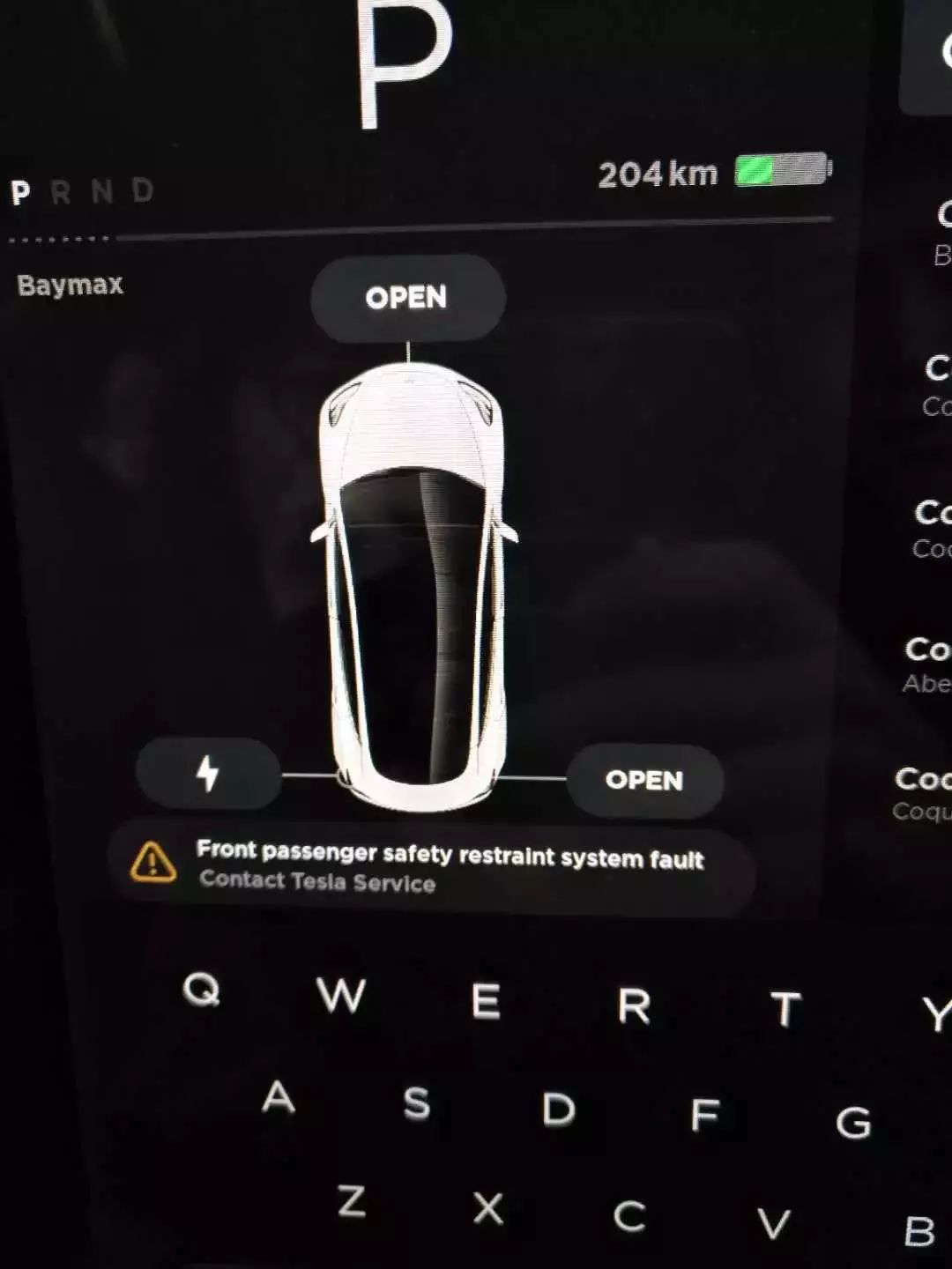 第二次(提车后不到 3 周):Front passenger safety restraint system fault 副驾驶的安全系统故障。与此同时,屏幕上的气囊灯亮了。