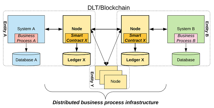 通过共享业务流程和包含状态,基于区块链技术的集成模型扩展了共享协议和服务合约,而且所有参与实体都能以智能合约的形式共享同一业务流程。但是,为了验证业务请求、处理并得出相同的结论,业务流程也需要保持相同的状态,而这只有通过分布式账本才能实现。共享智能合约过去的全部状态并不是实现这一目标的手段,而是共享业务流程运行的先决条件。