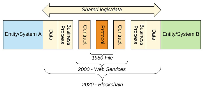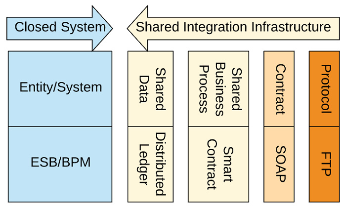 首先是协议(比如 FTO),然后是应用程序接口合约(比如 WSDL、SOAP),接下来是业务流程本身(比如智能合约),最后数据会移出到封闭系统之外,进入公共共享空间,并成为集成基础设施的一部分。在某些方面,这种趋势类似于微服务的横切责任(cross-cutting responsibilities)从服务内部转移到支持平台。