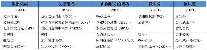 到目前为止,我们似乎很少看到某一个企业/组织的系统集成技术成为主流,因为这种技术的发展通常是建立在彼此支持的基础之上,而现实世界里的商业竞争往往让企业/组织之间变得越来越封闭。在此,我们并不是要专注于某个特定技术、或是某个特定的年份,而是尝试观察最近几十年来的发展,以便让大家了解为什么说区块链会是下一个技术迭代的关键要素。