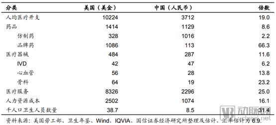 美国人均医疗开支达到中国的19倍。但是仿制药仅为2.2倍。同时服务的金额(除去医疗器械和药品,包括保险等各类依附于服务的类别)达到了25倍。