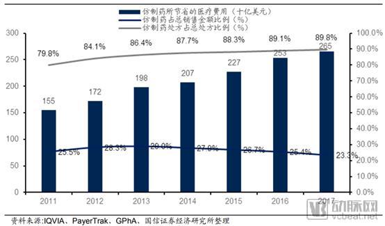 美国作为全球医药开支最高的国家,其仿制药用量比例过去持续增加,而消费金额持续降低。2017年仿制药占到90%处方量,但仅占到23%的销售额。