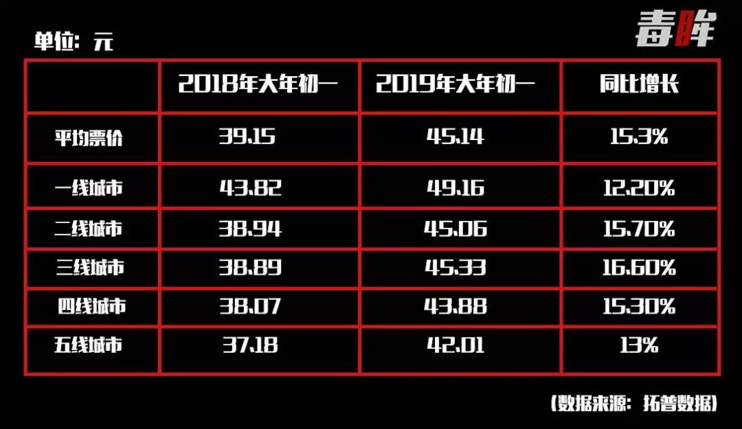 在这轮疯涨当中,二三四线地区成了票房疯涨的主力:拓普数据显示,去年大年初一,一二三四线城市的平均票价分别为43.82、38.94、38.89和38.07元,而今年初一则分别达到了49.19、45.06、45.33和43.88元,其中一线城市涨幅仅有12%,但二三四线城市涨幅却高达15.7%、16.6%和15.3%;而相较于 2018 年 25 元左右的平均票价,一些三四线地区在大年初一的票价涨幅更是超过了 80% 甚至是翻倍。
