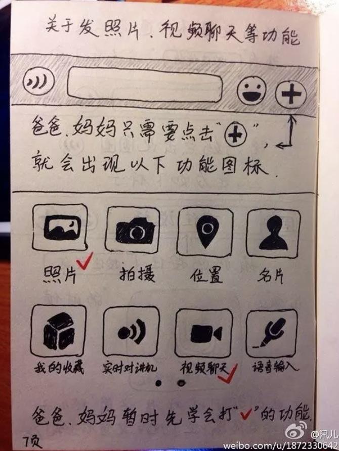 多年下来,我发现长辈很多问题是去年调好了,今年又来了,具有重复性。几年前,微博网友发出了一组自己为父母手绘的「微信使用说明书」,好让老人平时也能复习翻查。