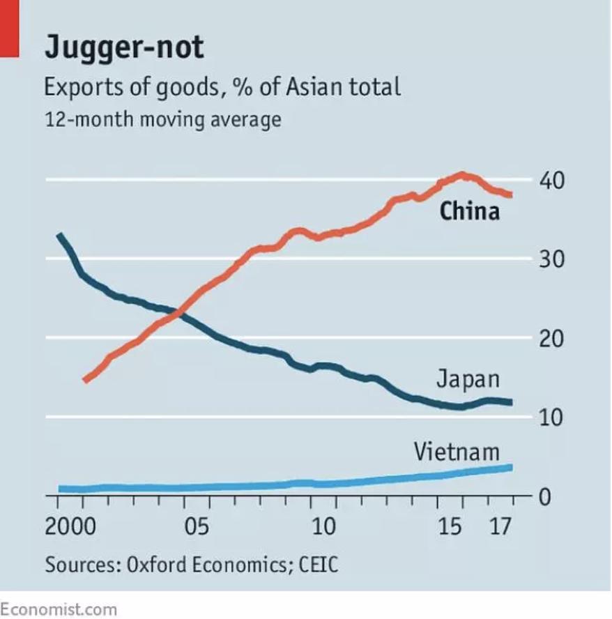 从1978年改革开放起,中国出口的比重占全球出口不断上升,尤其是2001年加入WTO之后,但2016年开始拐点发生,同时出口比重在亚洲的占比也开始下降,低价值市场上份额不断被越南蚕食,在高价值市场上,日本、韩国和中国台湾地区总计比重也在增加。此为后话了。