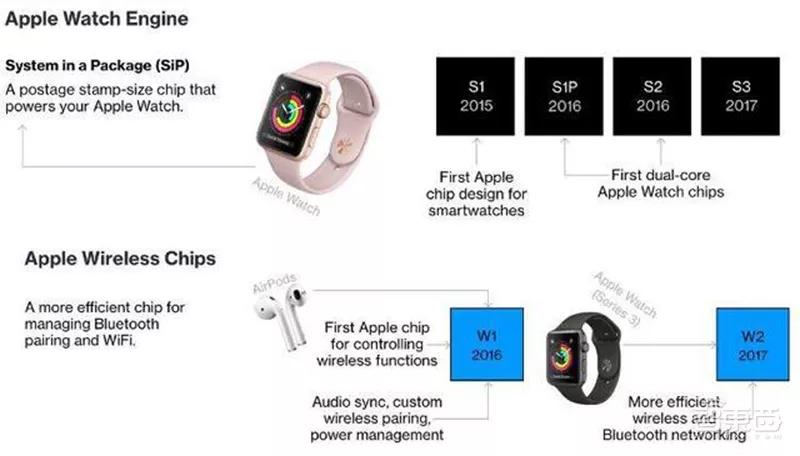 目前,苹果在iPhone和iPad产品线中形成了A系列芯片,其中在iPhone 4上,苹果推出第一款自主设计芯片A4,目前已经延续到A12。此外, 苹果在Apple Watch上推出S系列芯片,在无线蓝牙领域推出W系列芯片,在MacBook系列产品中推出T系列芯片。