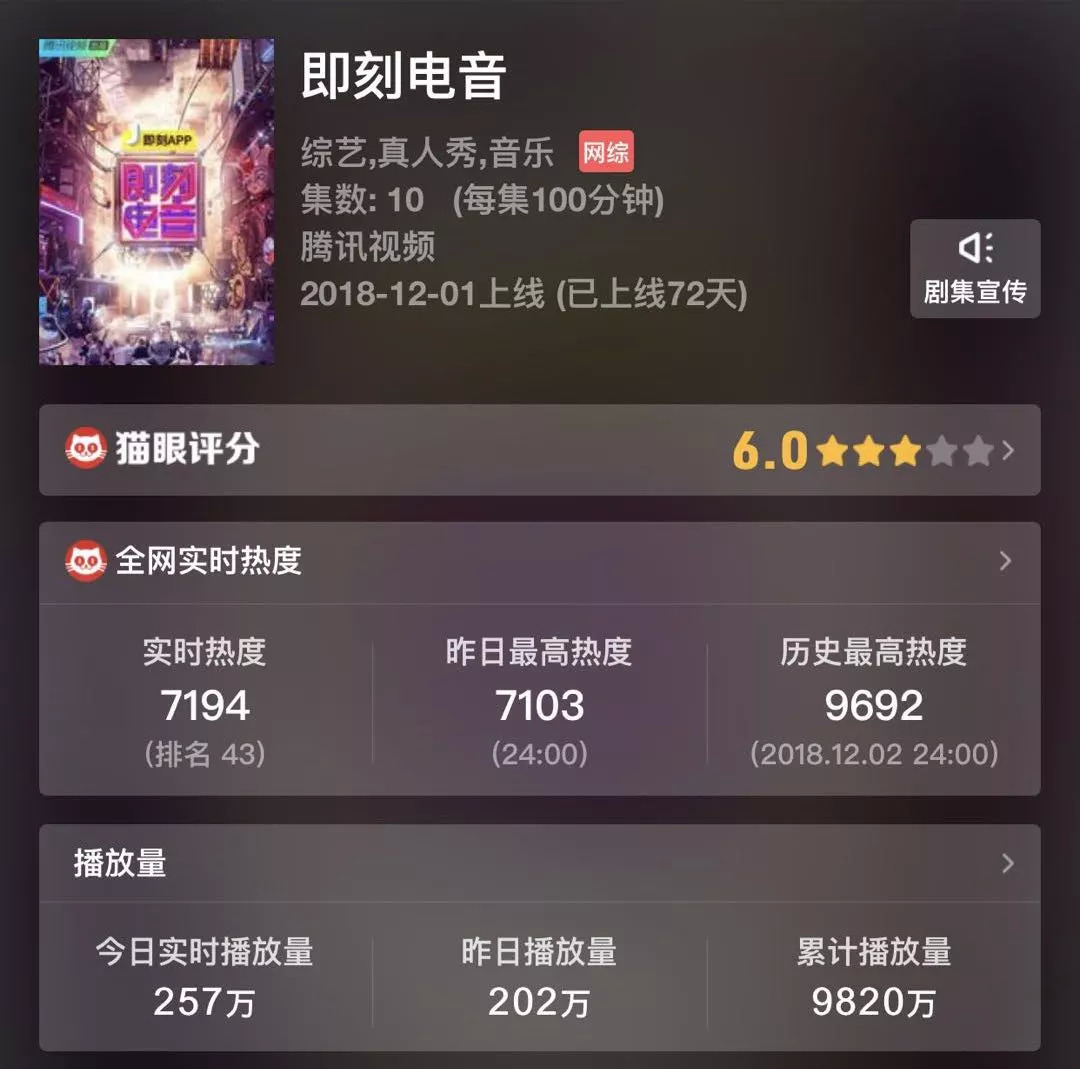腾讯视频推出的《即刻电音》就是在音乐行业对电音期待的背景下,在2018年登上综艺舞台的作品,截至目前,据猫眼数据节目累计播放量达到9820万,相关话题几次登上微博热搜,不过和以往引发的民谣热、说唱热相比,话题度和关注度上还是明显不足,这可能也与电音文化在中国发展的波折有关。