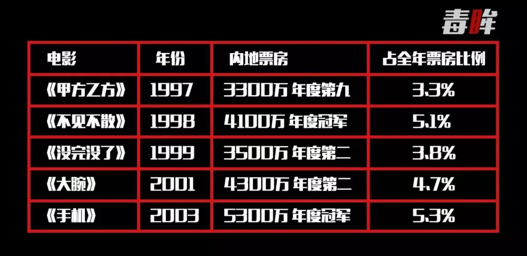 万万没想到,原本有些愤世嫉俗的冯小刚非但没整出任何麻烦,还制造了个大惊喜:《甲方乙方》在1997年卖到了3300万,占当年总票房的比例达到了3.3%。《甲方乙方》的成功,激活了内地贺岁档,也给“冯氏喜剧”开了个好头。随后几年,冯小刚又和葛优合作了《不见不散》《没完没了》等贺岁喜剧,拍一部火一部,一时间风光无两。