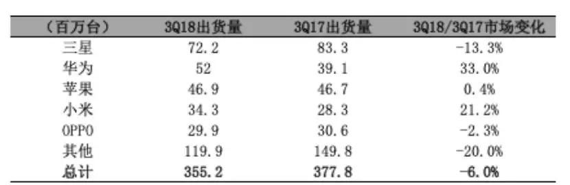 IDC数据显示,3Q18全球智能手机出货3.552亿台,同比下滑6%,这是全球连续第四个季度出货量的下滑。而几大智能手机巨头的情况均印证了市场的担忧。