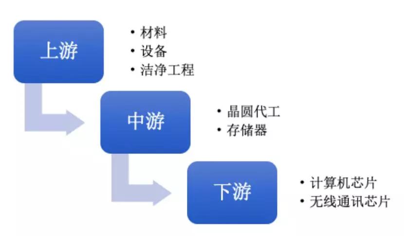 从上游到下游,半导体行业主要包括上游的半导体设备、材料板块,中游的晶圆、存储器板块,以及下游的计算机芯片、无线通讯芯片等板块。
