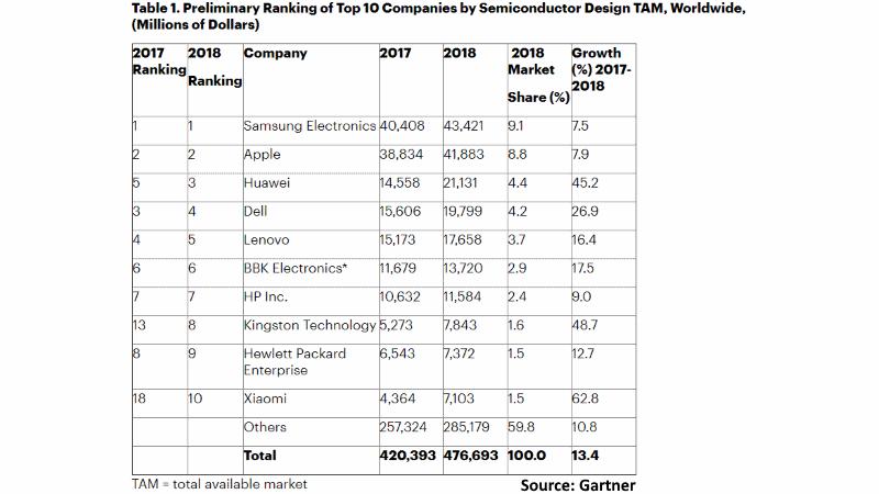 根据Gartner的数据,2017年前十大公司中有八家在2018年保持在前十名,其中美国内存芯片制造商金士顿科技和中国的小米取代了韩国的LG电子和日本的索尼。