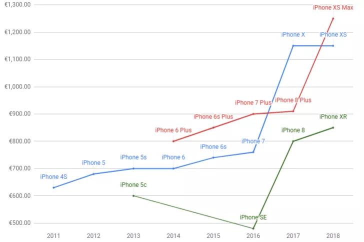 ▲2011 年之后 iPhone 的定价走势,图自:GSMArena