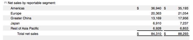 分地区看,大中华区销售剧减,拖累整体业绩。财报显示,苹果在中国市场的销售额同比下降将近27%,在各主要市场中降幅最大,降幅第二位的日本降幅不超过5%,日本以外亚太区整体销售还增长了1%以上。
