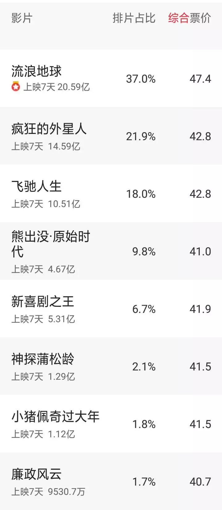 在豆瓣上,《流浪地球》评分从开画8.5逐步下滑到7.9,《飞驰人生》评分7.0,《疯狂的外星人》评分6.4,《熊出没·原始时代》评分6.6,《新喜剧之王》评分5.8,《神探蒲松龄》评分4.2。而随着观众的观影经验增长、对影片质量要求提高,市场正朝着一个良性循环发展,好的影片才能得到好的票房。可以看到,影片的票房表现基本和评分排名一致。