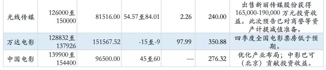 值得一提的是此次主控两部影片杀入春节档的中影。《流浪地球》毫无疑问将带来可观收益,而在年报预披露中,中影在影视板块拿到最佳的勋章:净利润预增13.99亿-15.44亿,同比增45%-60%,在同行巨亏声一片中乃一股清流。此外,有券商预计,2019年是进口片大年,低基数效应下或带来新一轮业绩增长。