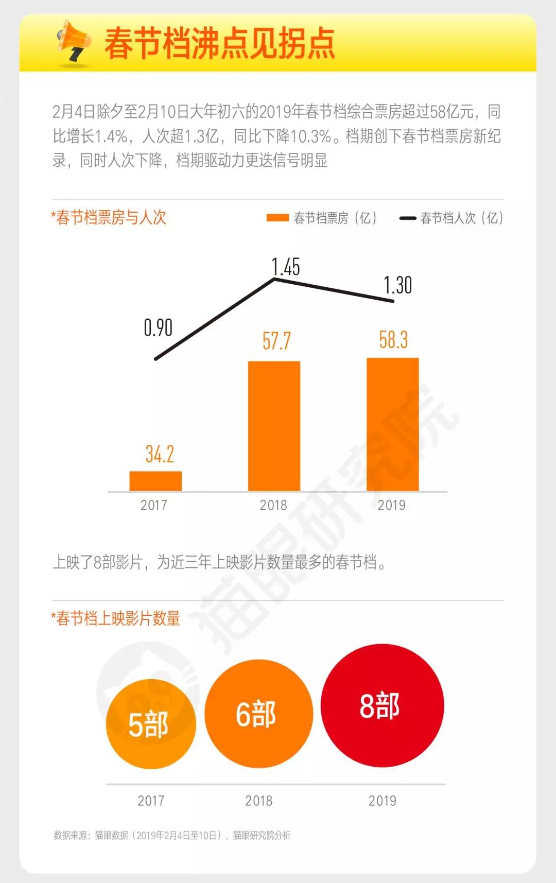 然而,今年春节档全部影片票房仅斩获58.3亿,较去年的57.7亿仅增长1.3%,跟6.4%的GDP增速、9%的社会消费品零售增速比起来,实在算不上好成绩。更值得让人担忧的是,观影人次从1.44亿大幅下滑到1.3亿人次,而往年观众重刷、观看多部影片的频次也出现明显下降。