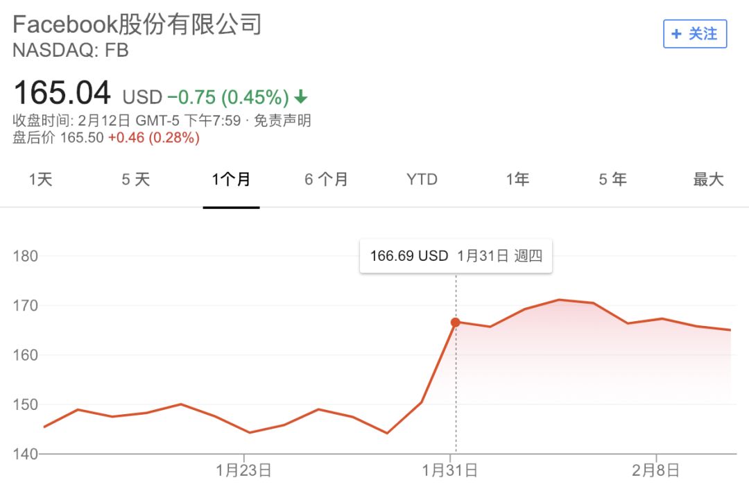 1 月 30 日,Facebook 盘后股价疯涨 12%,一扫阴霾。
