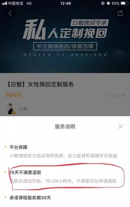白魅导师团队在给用户承诺的广告词上宣称,15天可以挽回感情,且情感导师需要每天与用户联系进行咨询服务,但是实际情况却是,学员交了钱联系不上导师。