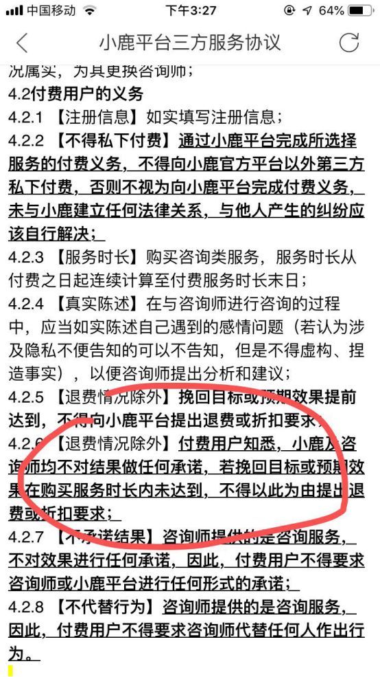 小鹿在其平台三方服务协议写道:“付费用户知悉,小鹿及咨询师均不对结果做任何承诺,若挽回目标或预期效果在购买服务时长内未达到,不得以此为由提出退费或折扣要求。”“咨询师提供的是咨询服务,付费用户不得要求咨询师或小鹿平台进行任何形式的承诺。”