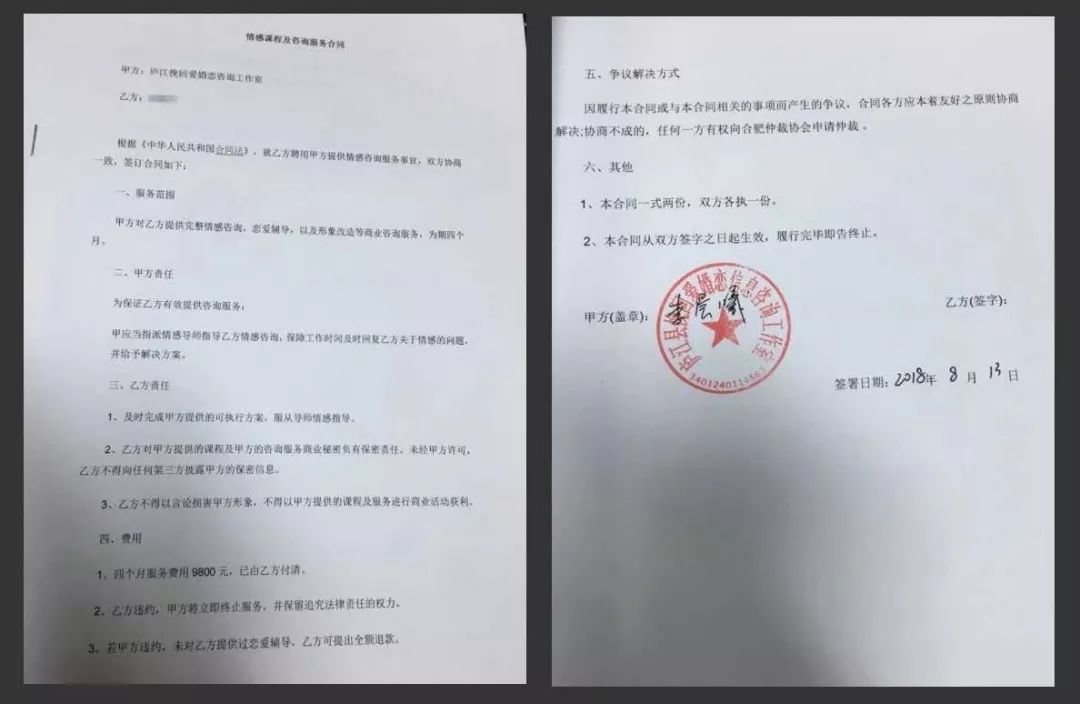 即便有些消费者跟小鹿情感签了合同,效果也不尽人意。张果在跟“白魅团队”合作时,在她强烈要求下勉强签了一份非常简单的合同。