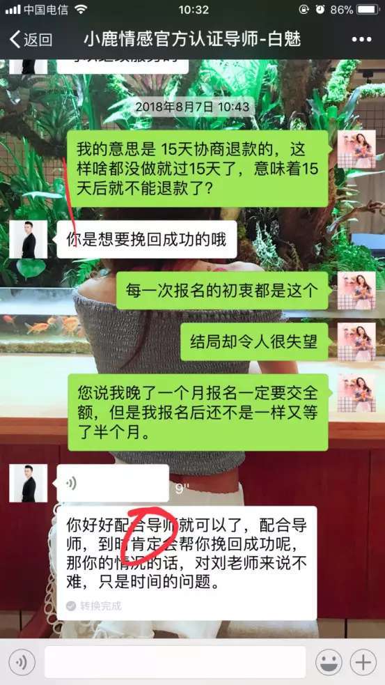 小鹿情感平台退款期限是15天以内。锌财经发现,消费者退款艰难多是因为这个“15天骗局”。若导师在15天之内直接玩消失,学员申请退款可能被拒绝,因为已经“过了15天”。