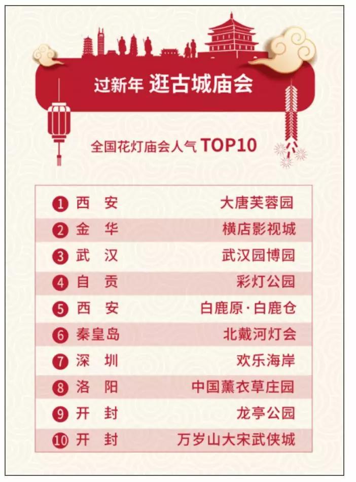 据美团门票发布的《2019春节游关键趋势预测》显示,全国花灯庙会排行榜TOP10中,大唐芙蓉园、横店影视城、武汉园博园位列三甲,北京众多庙会没有一场进入榜单前十。