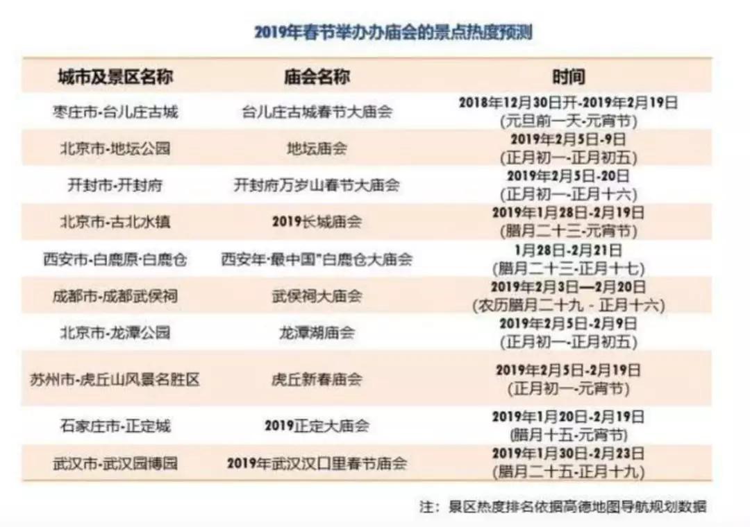 高德地图发布的2019春节庙会景点热度预测显示,热度最高的10个庙会中,热度排名第一庙会并不在北京,而是山东台儿庄古城的春节大庙会,此外,开封万岁山庙会、西安白鹿原白鹿仓庙会、成都武侯祠大庙会的排名也并不输给北京同行。