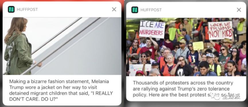 在被推送的图像中,有一半是包含美国总统特朗普在内的政府高级官员照片,另一半则是受移民政策影响的民众照片。鲜少应用富媒体内容的《赫芬顿邮报》则在仅有的3条富媒体推送中,以图像和文字相结合的方式交代了新闻报道中经典的“5W”。