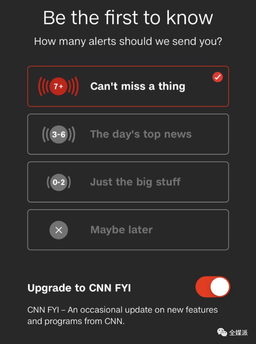 CNN则根据用户自己设定的兴趣板块进行细分制推送,CNN方面表示,灵活的推送机制能够避免对用户造成信息过载。