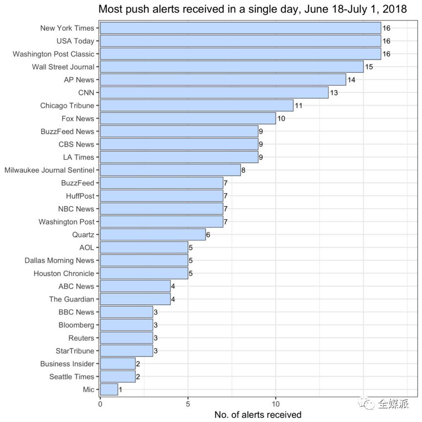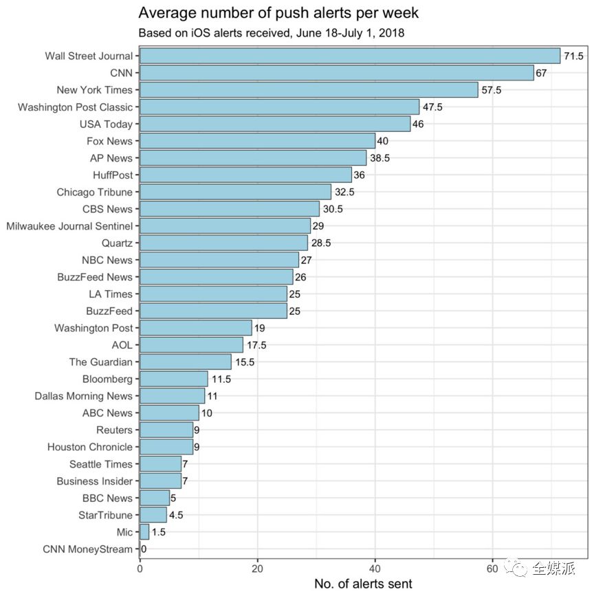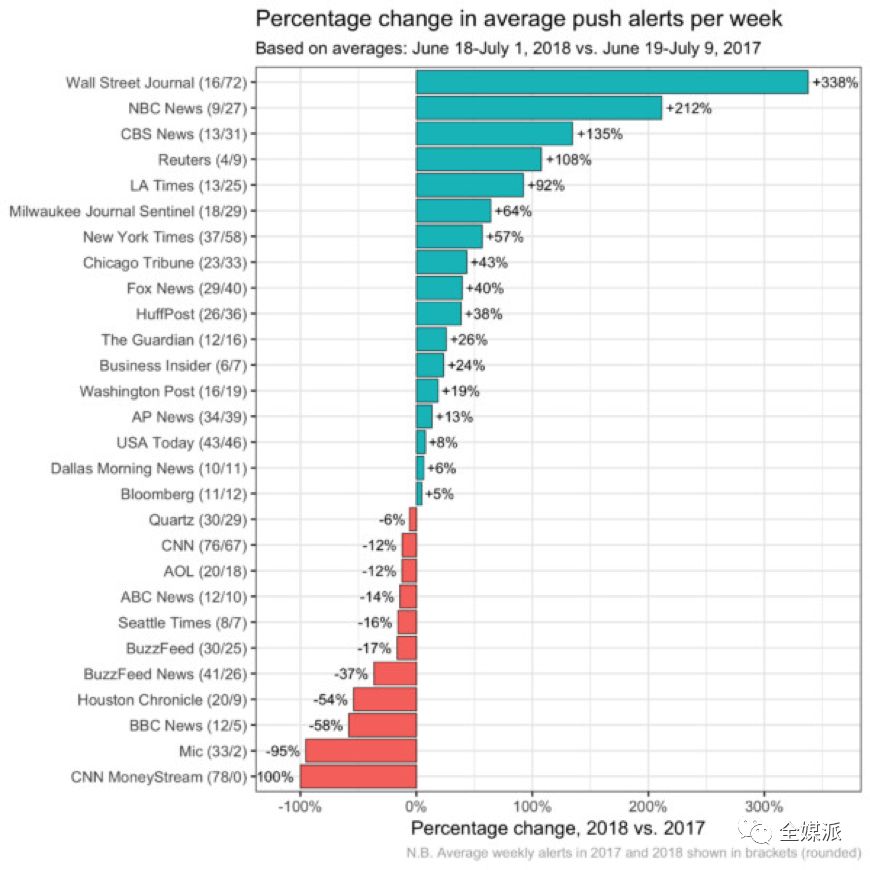 在Tow中心监测的30家新闻机构中,每周平均Push数量从2017年的22.4次上升至26次。