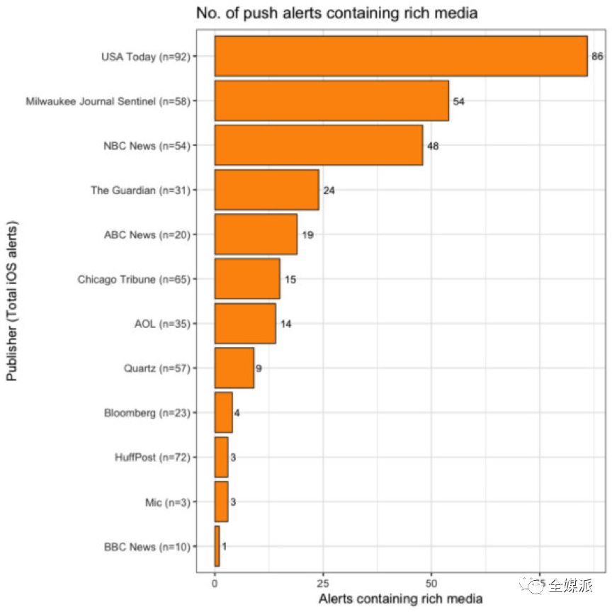 2017年,Gannett旗下的新闻应用《今日美国》和《密尔沃基哨兵报》以多次应用富媒体进行推送而受到关注,它们也是唯二两家借助视频内容进行推送的媒体。2018年监测期内,《今日美国》共发布了92条推送,其中71条为视频内容;《密尔沃基哨兵报》共发布了58条推送,其中13条为视频内容。